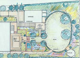 Die gewählte Variante wird in einem Entwurf zu einer endgültigen Lösung weiterentwickelt und mit vielen Angaben ergänzt: Gestaltungselemente wie Wasserbecken, Mauern, Pergolen oder Sichtschutzelemente werden eingeplant, die Materialauswahl für Terrassen und Wege getroffen, Aussagen über Erdmodellierungen und Höhen, z.B. Abstützungen und Treppen gemacht und der Bepflanzungsstil wird stichwortartig beschrieben.